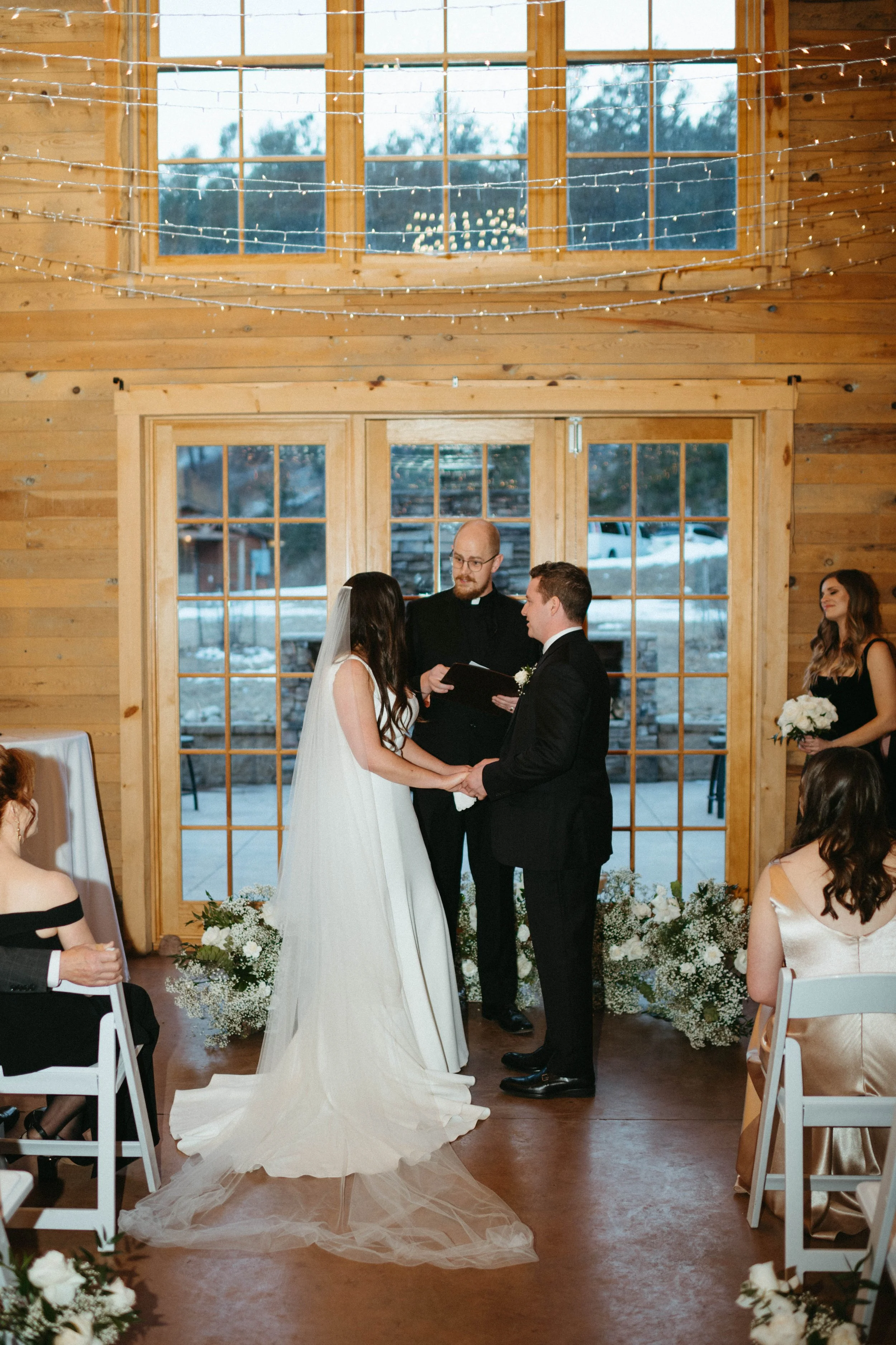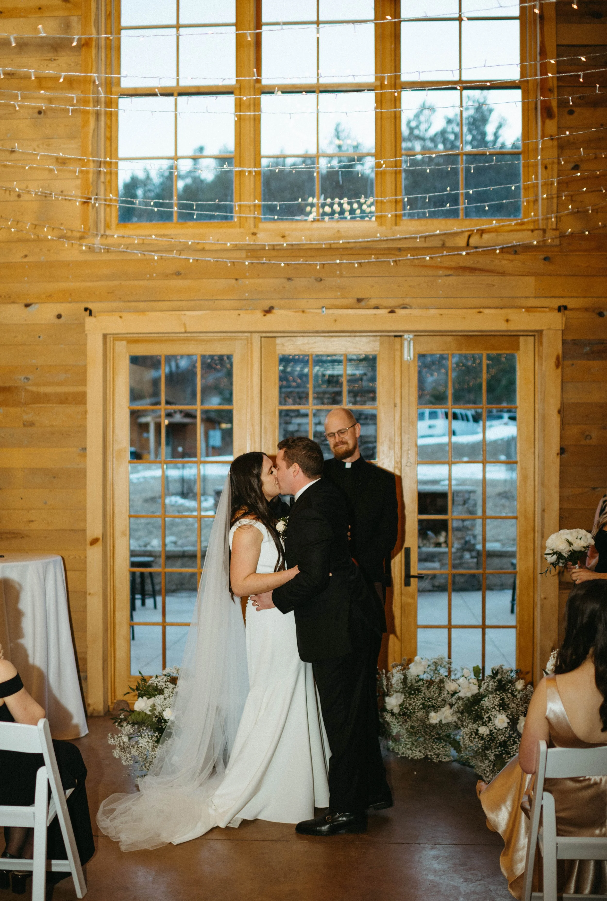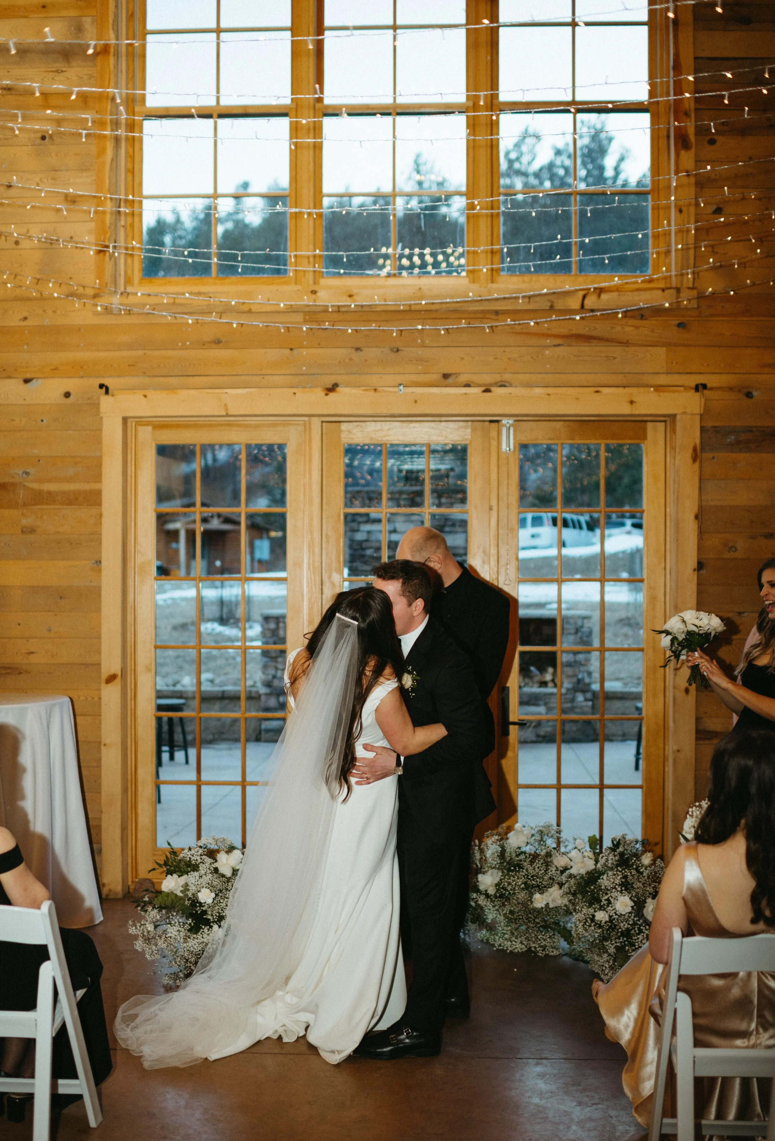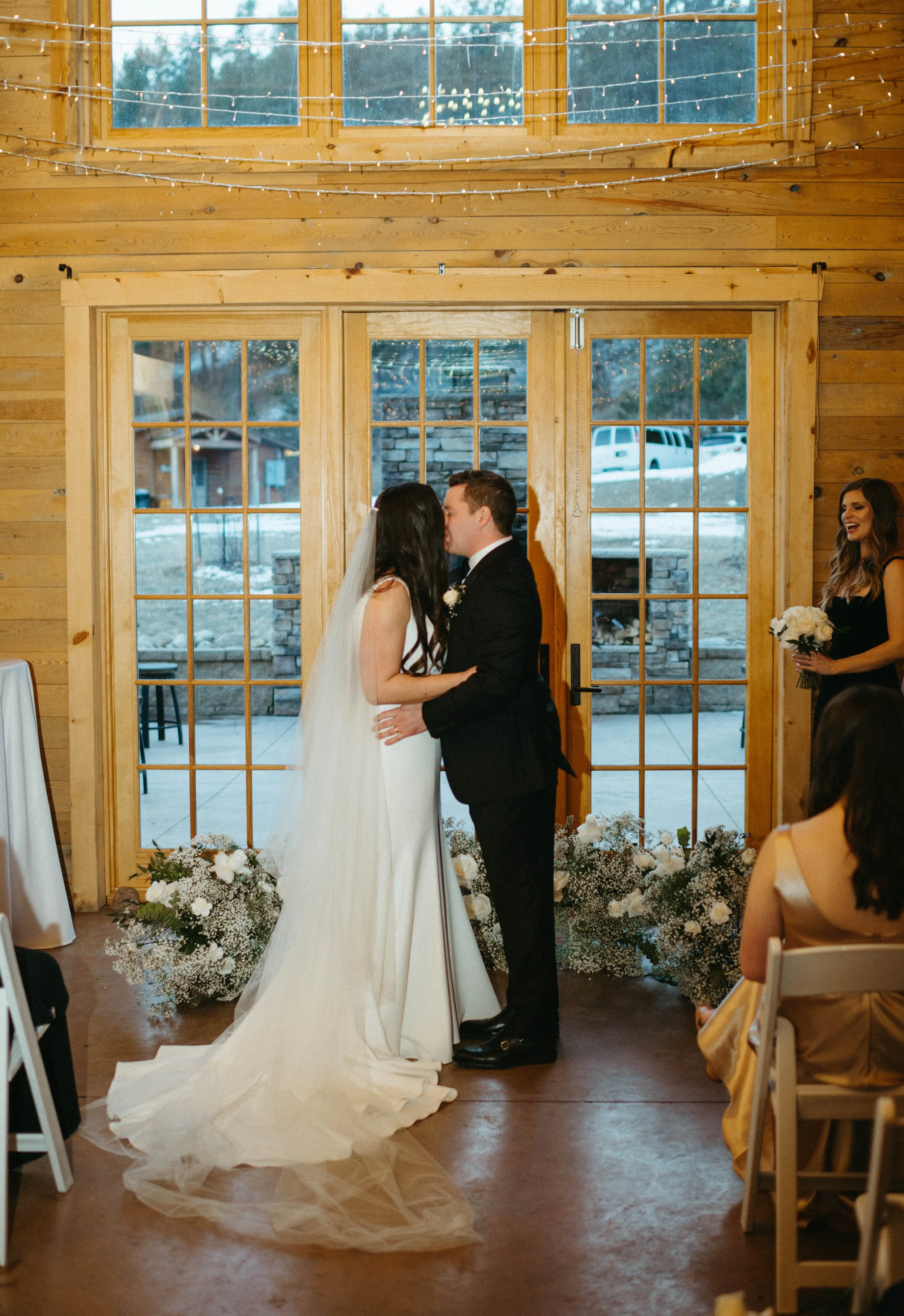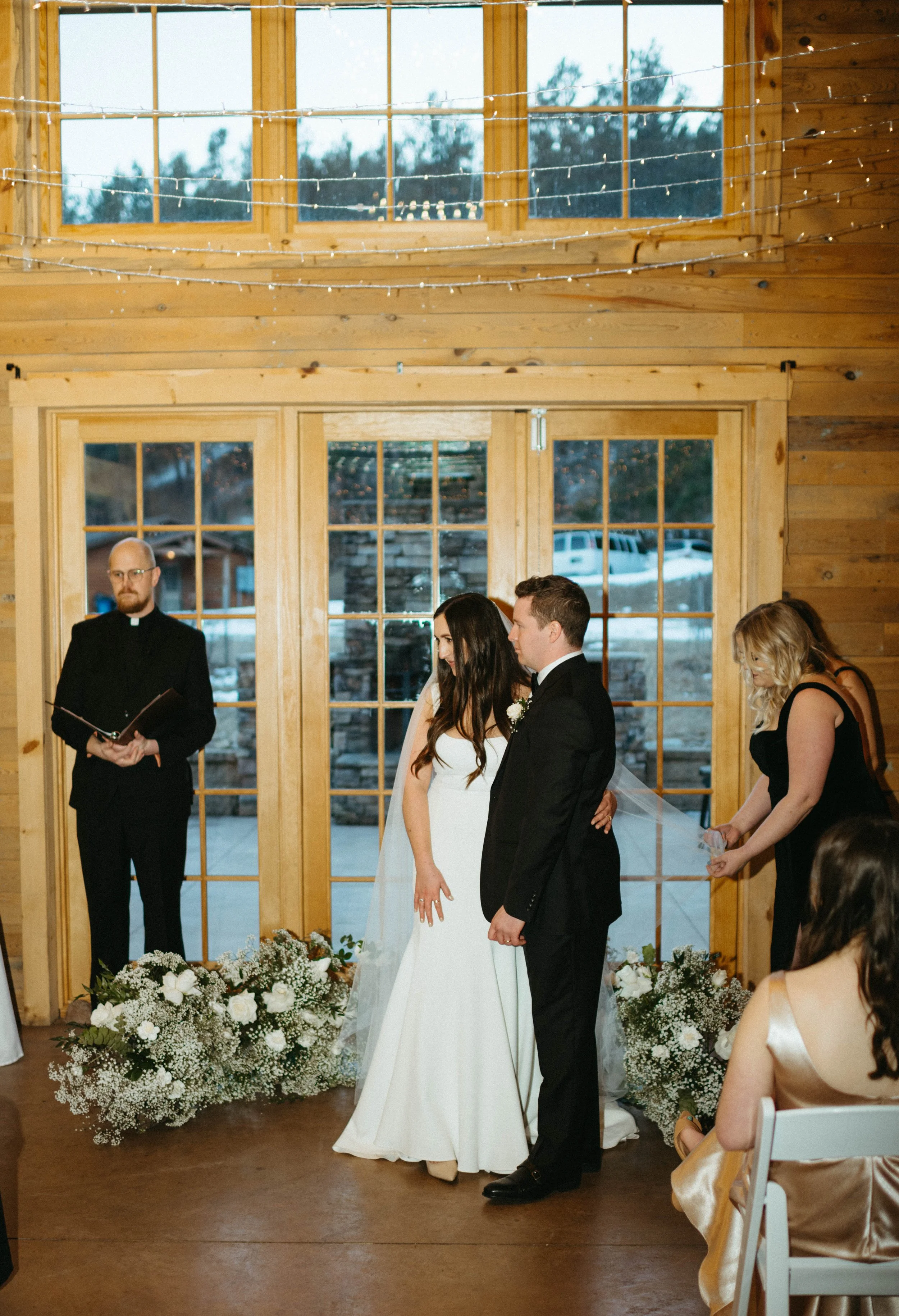 Becca and Peterβs winter wedding at the Custer State Park Game Lodge in the Black Hills of South Dakota was a vision of romance and elegance. The ceremony showcased a breathtaking display of white roses, with a dreamy meadow of baby's breath creating ethereal floral clouds overhead. Amidst the majestic backdrop of roaming buffalo, guests dressed in black tie attire added to the sophisticated atmosphere. Beccaβs elegant bridal bouquet, held with grace, perfectly complemented the refined elegance of the day.