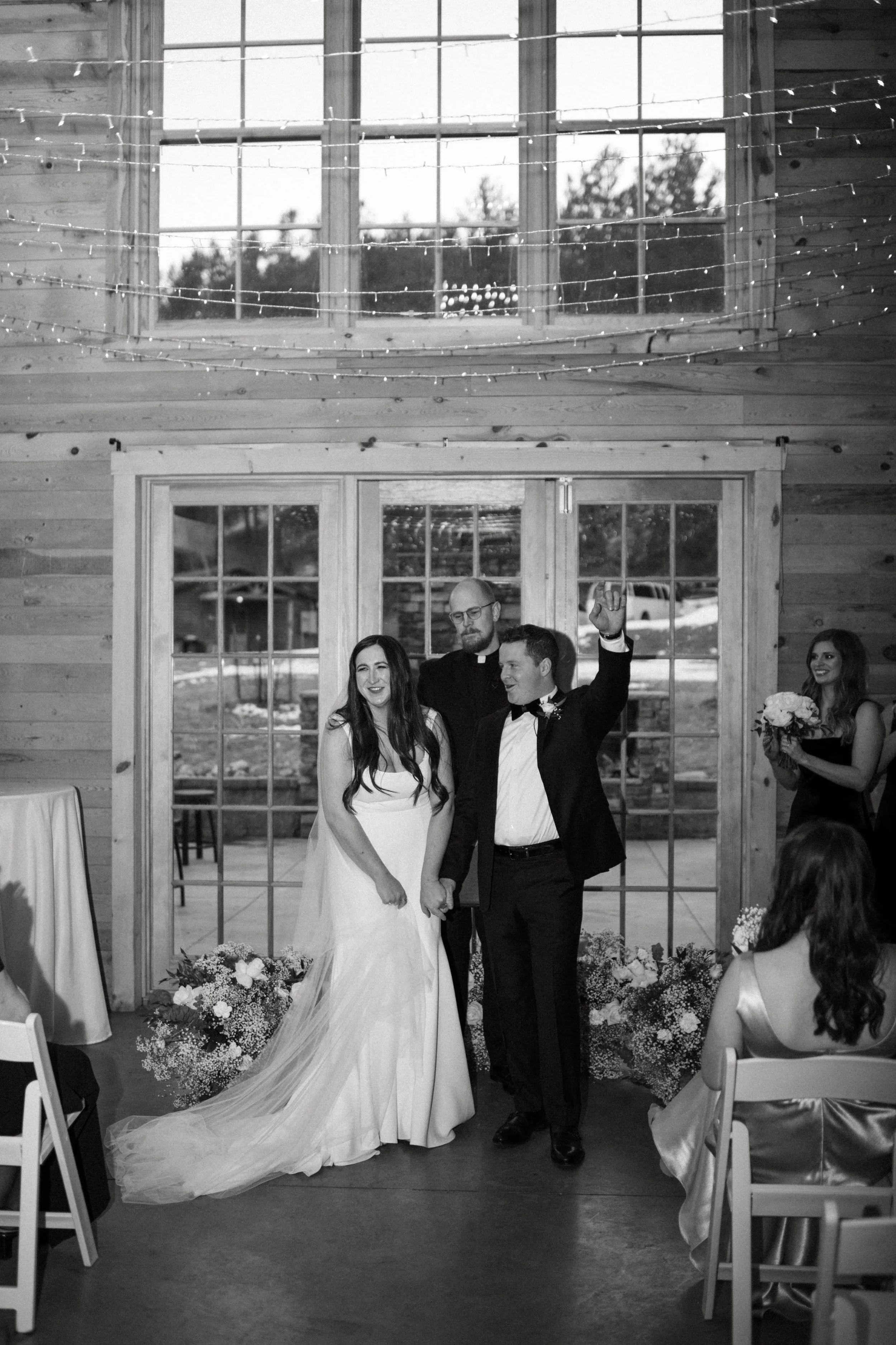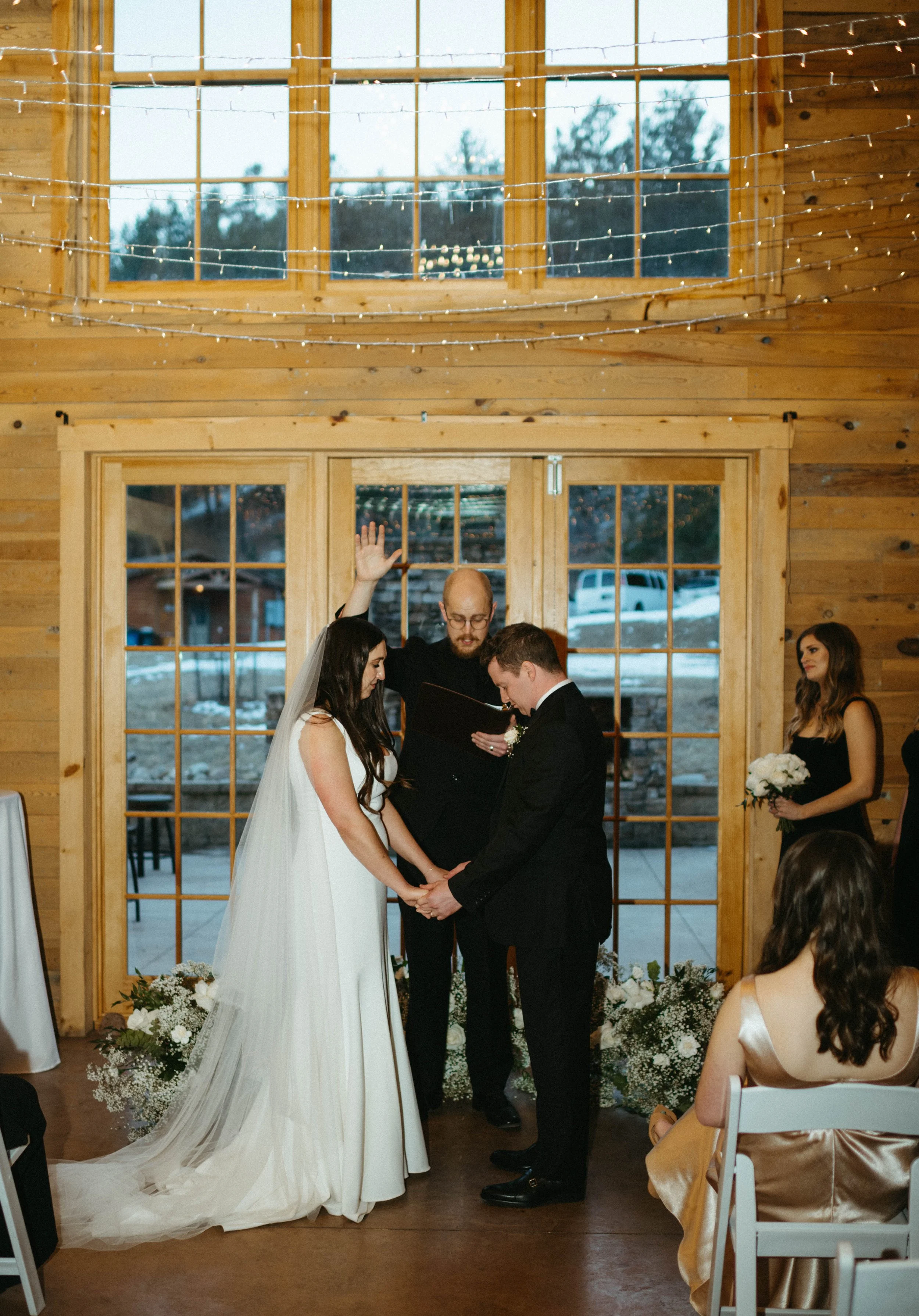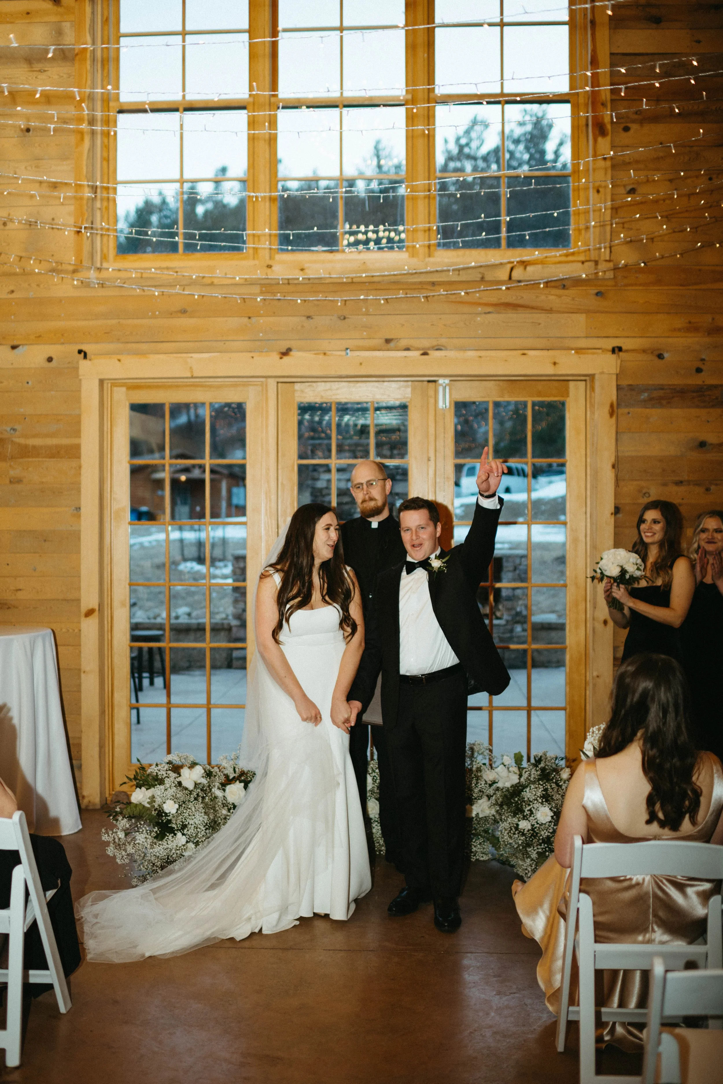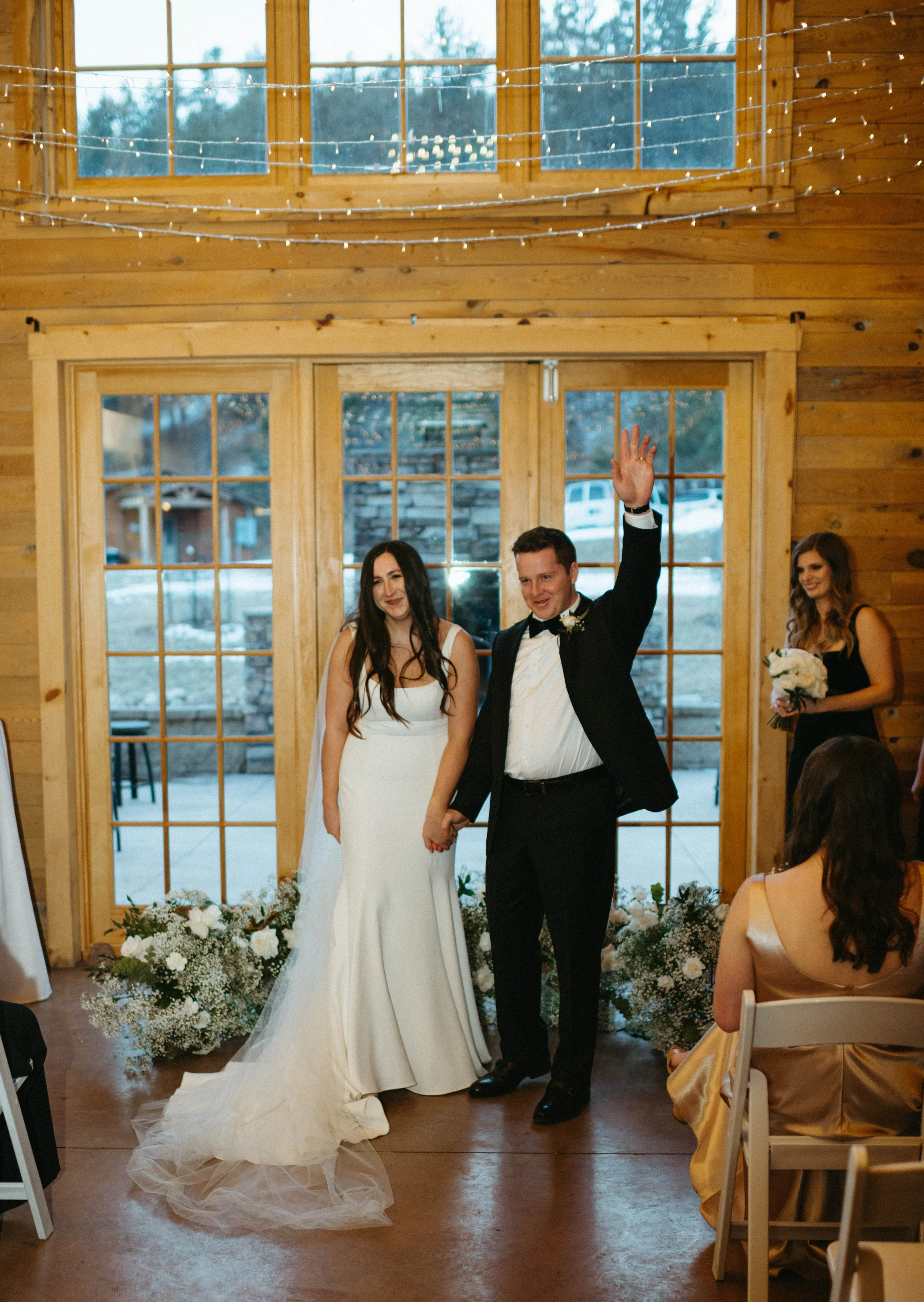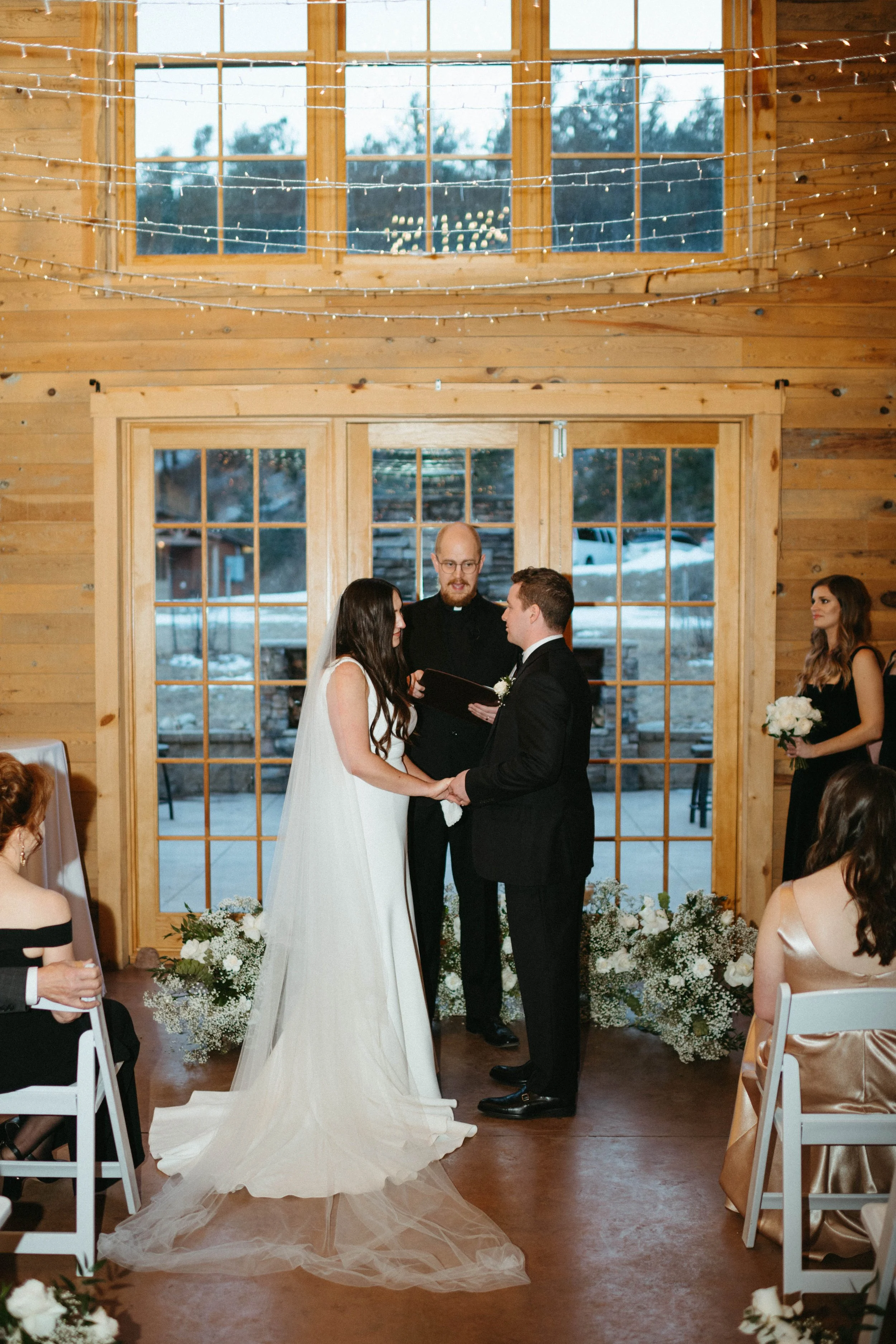 Becca and Peterβs winter wedding at the Custer State Park Game Lodge in the Black Hills of South Dakota was a vision of romance and elegance. The ceremony showcased a breathtaking display of white roses, with a dreamy meadow of baby's breath creating ethereal floral clouds overhead. Amidst the majestic backdrop of roaming buffalo, guests dressed in black tie attire added to the sophisticated atmosphere. Beccaβs elegant bridal bouquet, held with grace, perfectly complemented the refined elegance of the day.