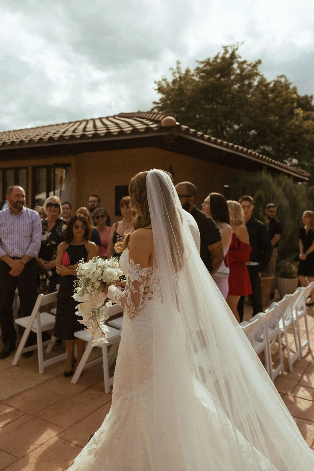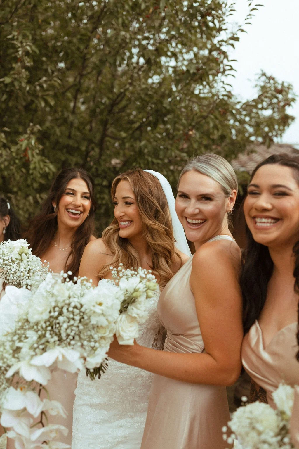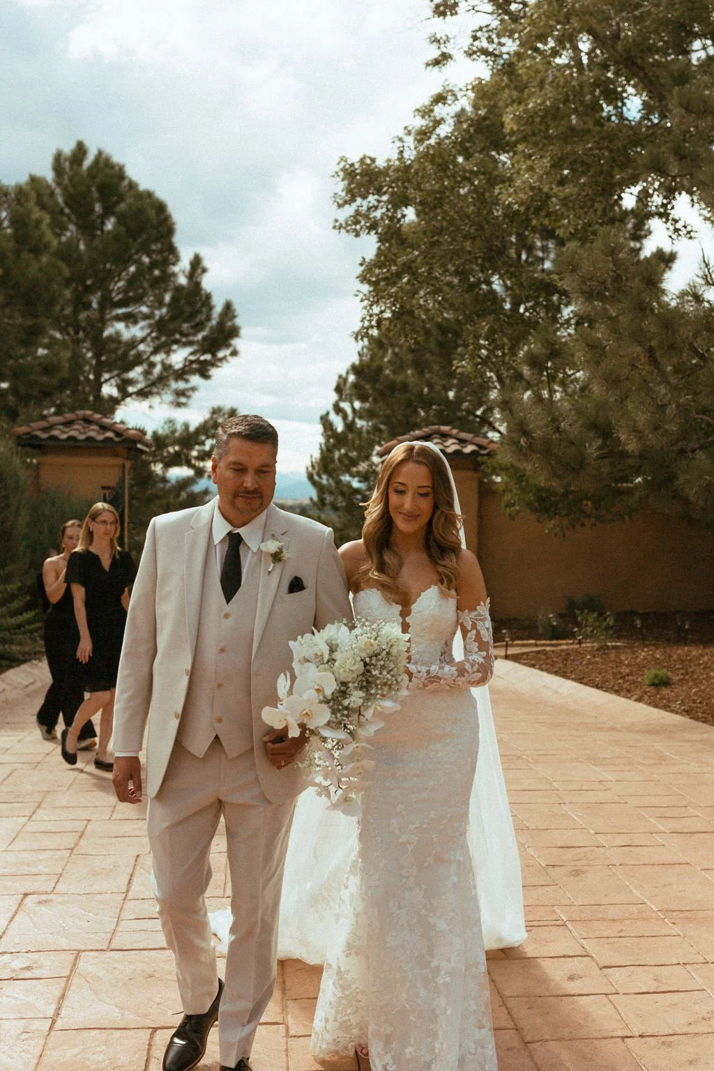 Shayla and Michael's dreamy wedding day was nothing short of showstopping, set against the stunning backdrop of Villa Parker, a Mediterranean estate just outside of Denver. The celebration featured an elegant white color palette, with lush florals including dahlias, roses, ranunculus, and cosmos. Shayla's bridal bouquet, adorned with cascading orchids and tied with a delicate white silk ribbon, added a touch of timeless beauty to the day.
