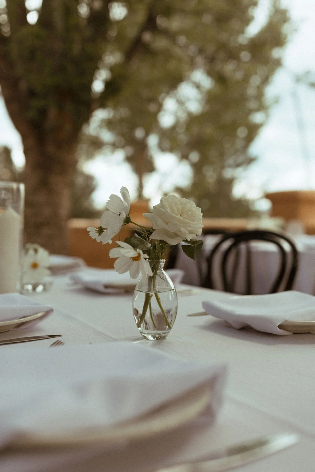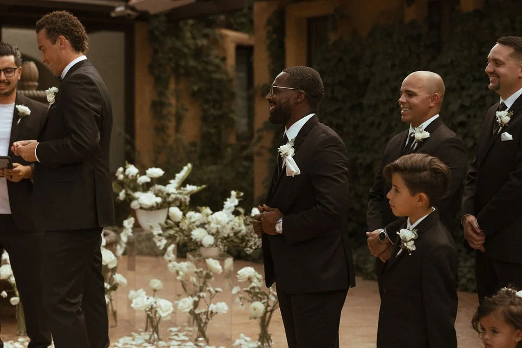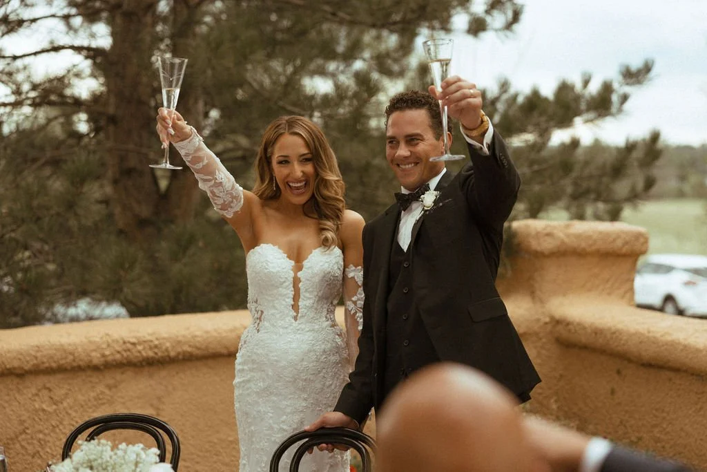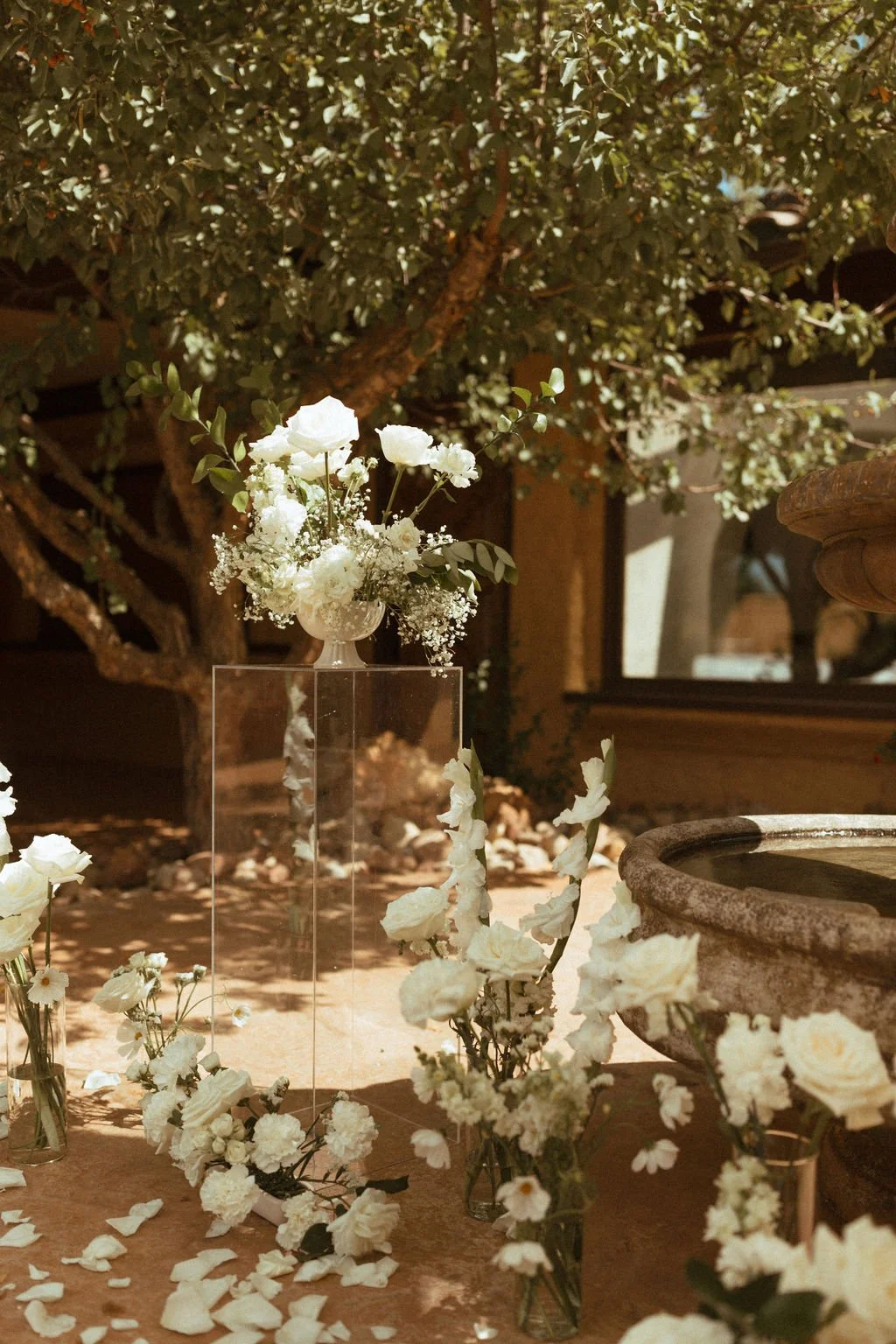 Shayla and Michael's dreamy wedding day was nothing short of showstopping, set against the stunning backdrop of Villa Parker, a Mediterranean estate just outside of Denver. The celebration featured an elegant white color palette, with lush florals including dahlias, roses, ranunculus, and cosmos. Shayla's bridal bouquet, adorned with cascading orchids and tied with a delicate white silk ribbon, added a touch of timeless beauty to the day.